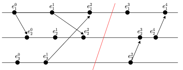 下图中,直线上小黑点给出了时钟计数,请分别用Lamport 逻辑时钟和向量时钟给图上的事件设置时间戳,并给出一致割集和非一致割集的例子。