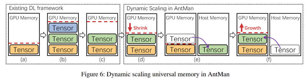 - AntMan转向了扩展GPU内存上限的方法。它主动检测使用中的内存,以缩小缓存的内存,从而自省地将GPU内存的使用调整合适。这是通过监测应用性能和处理小批量时的内存需求来实现的(图6d)。AntMan使用其最大的努力在GPU设备上分配张量,然而,如果GPU内存仍然缺乏,张量可以在GPU之外用主机内存分配(图6e)。当GPU内存的上限增加时,Tensors可以自动分配回GPU(图6f)。