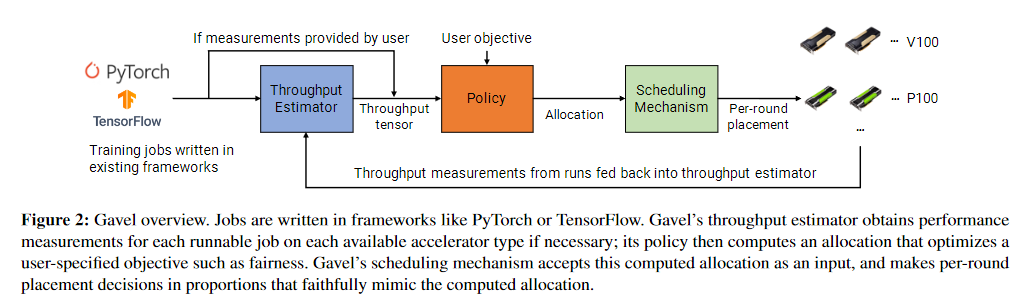- Gavel 的调度机制需要能够调度同时请求多个加速器的分布式训练作业,以及由于空间共享而在给定加速器上同时运行的作业组合。