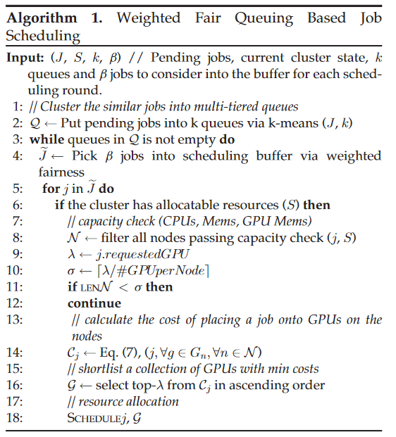 - line 14: 用方程式(7) ,然后我们可以计算在 N (第14行)中每个节点的每个 GPU 上调度作业的成本