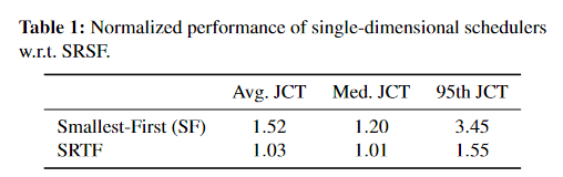 - 尽管已知最短作业优先 (SJF) 和最短剩余时间优先 (SRTF) 算法可以最小化平均 JCT ,但它们需要作业的剩余执行时间,而这对于 DL 训练作业来说通常是未知的.