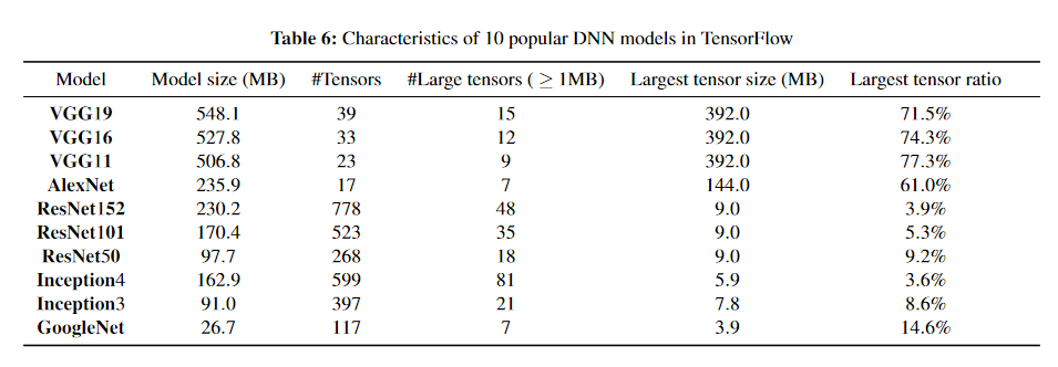 深度学习模型中对于合并敏感的一般都有较大的张量, 原因是模型聚合中的消息大小与模型的结构密切相关。 例如,TensorFlow中的模型由许多张量组成。 每个张量都被包装为单个通信消息。因此,DDL中的消息大小分布取决于模型的张量大小分布。 张量大小通常分布不均匀; 有时存在巨大的张量,其中包含这些模型中的大部分参数。 因此,聚合较大的张量会更严重地受到网络争用的影响,而较小张量的传输往往会相互交错。